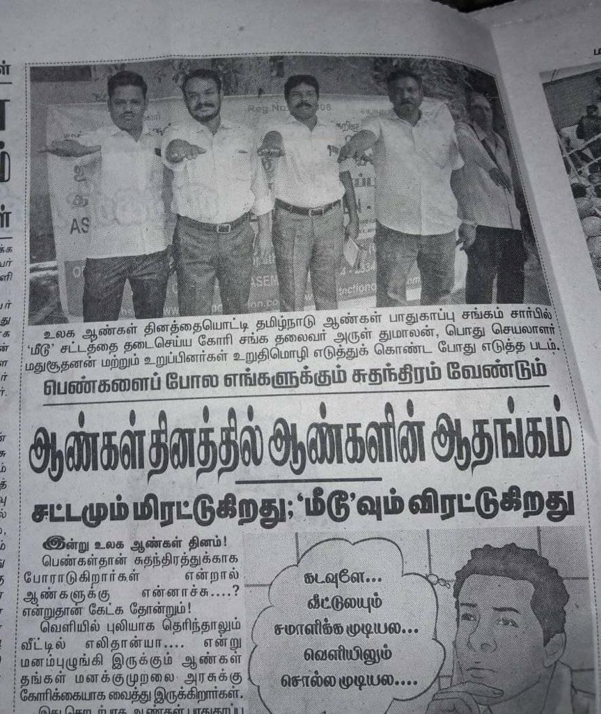 “The Association for Protection of Men-Tamilnadu” was started in the year 2007 but due to some hindrances the same was not able to register in the government register but still it worked as an unregistered association and subsequently the same had been registered in the year, 2008 and after the registration of the same there were various welfare and awareness program had been conducted on behalf of the association for the welfare of men and there were various agitation programs and public programs were conducted for the welfare and to create awareness among men in a successful manner and the association is still working on the process of creating awareness among men’s in the society and working for the welfare of men.
